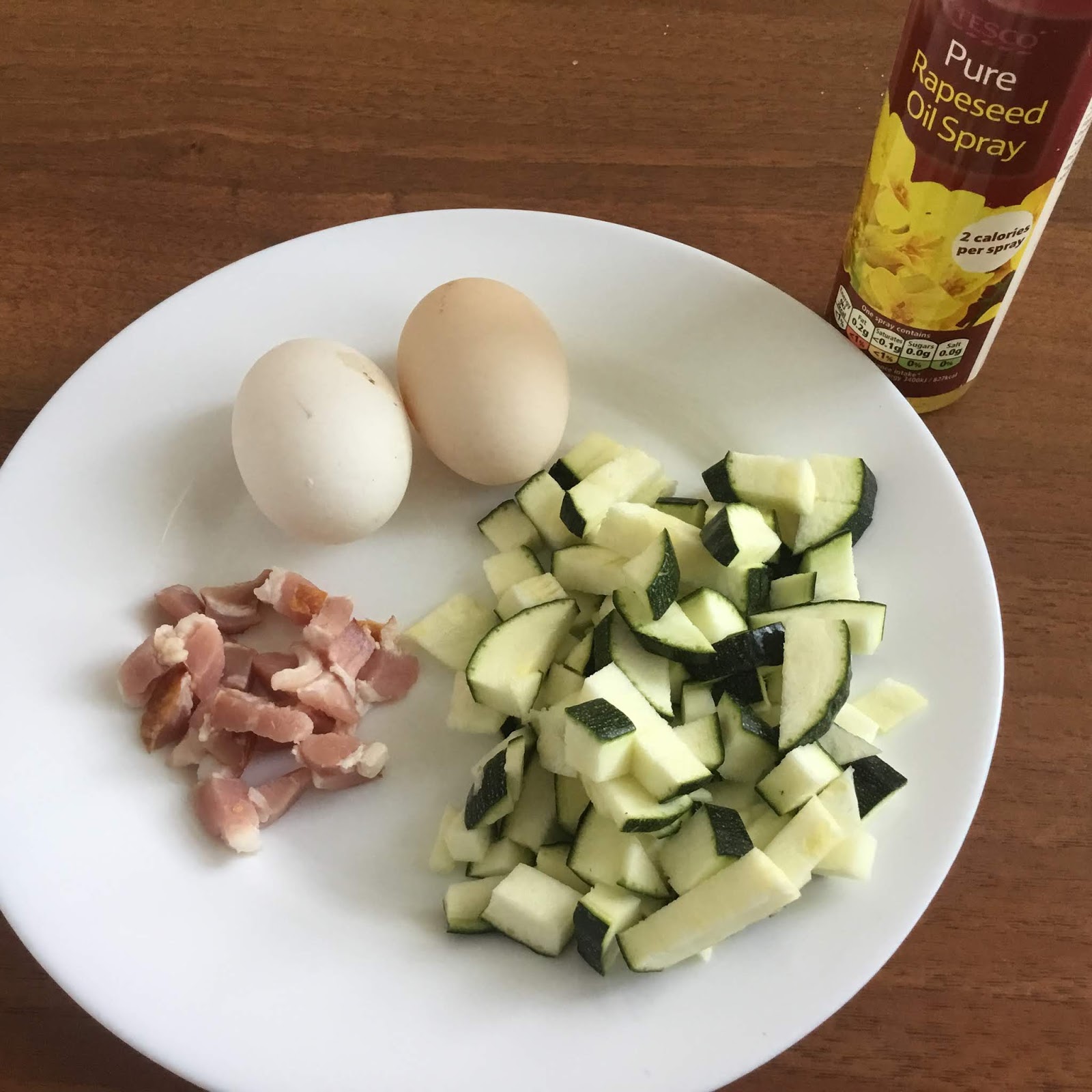 Ingredients for a Low FODMAP courgette and bacon scrambled egg: