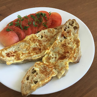 Dip 2 slices of sourdough bread in the egg, fry on a non stick pan, using oil spray.