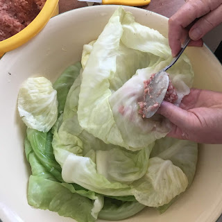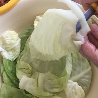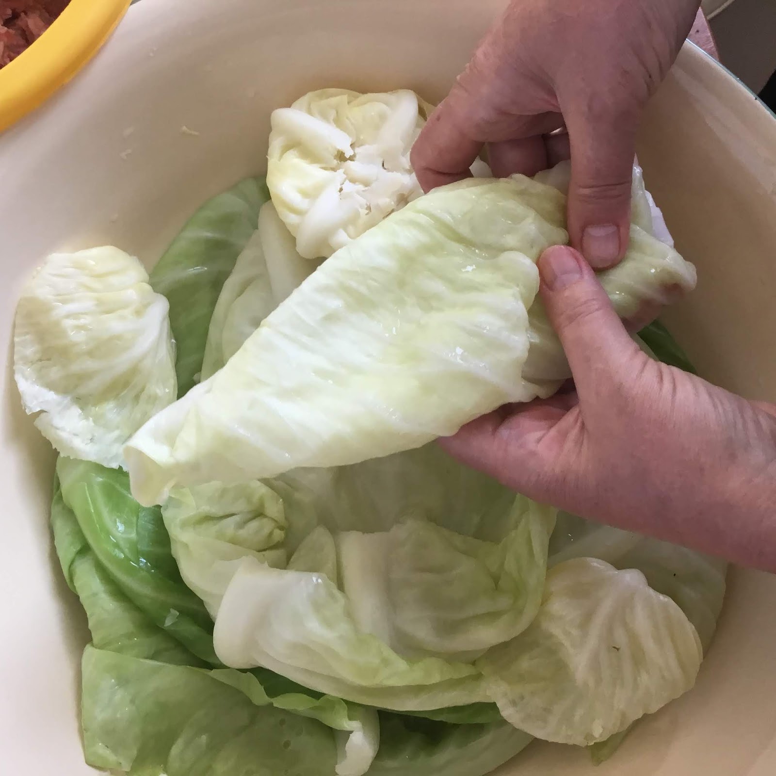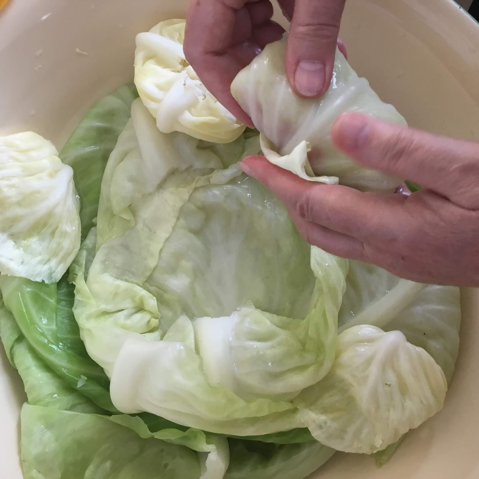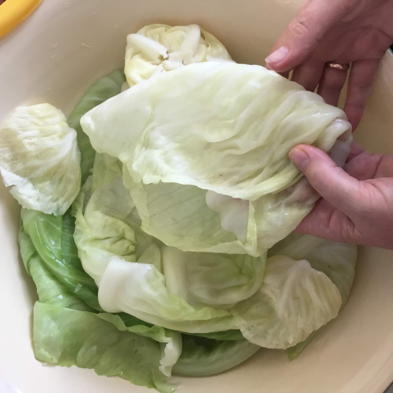 Cut out the hearts from the cabbage. If the cabbage fits in your microwave (mine didn’t), place the cabbage in the microwave, cook for 1 minute, remove it from the microwave, and remove few outer leaves, if possible. If not, cook in the microwave again. You have to repeat this process of microwaving and removing leaves from the cabbage until all leaves are loose.